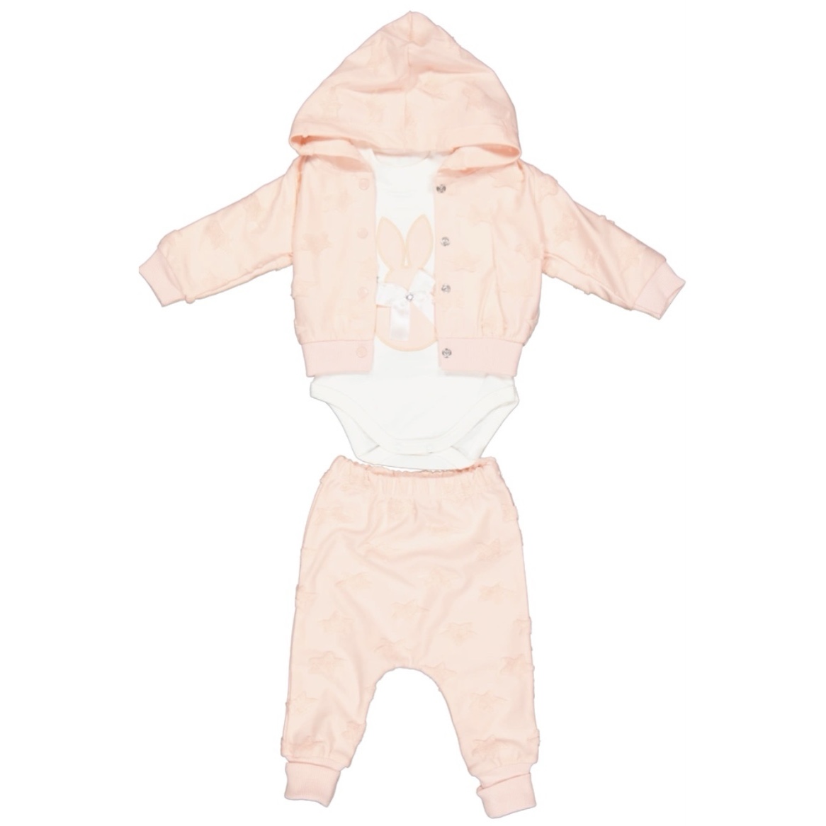 Костюм тройка для девочки состоит из боди, ползунков и кофточки с капюшоном на кнопках.