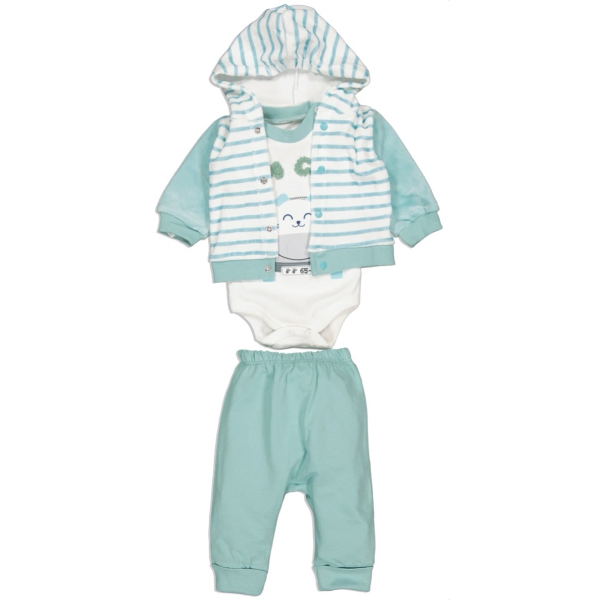 Костюм тройка для мальчика состоит из боди, ползунков и кофточки с капюшоном на кнопках.